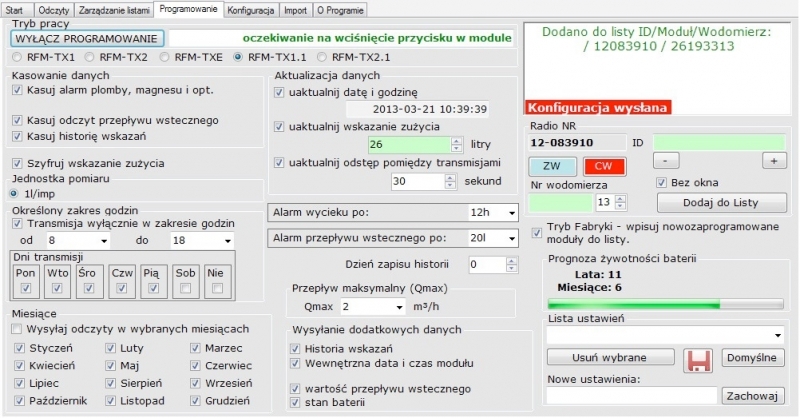 Alarmy: Program sygnalizuje następujące zdarzenia: przyłożenie magnesu do licznika, próba oszukania czujnika optycznego, przepływ wsteczny, wyciek wody, niski stan baterii, przekroczenie przepływu maksymalnego oraz demontaż modułu.