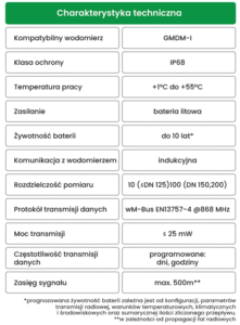 * prognozowana żywotność baterii zależna jest od konfiguracji, parametrów transmisji radiowej, warunków temperaturowych, klimatycznych i środowiskowych oraz sumarycznej ilości zliczonego przepływu.