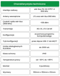 INTERFEJS RADIOWY – Koncentrator zbiera dane wysyłane drogą radiową przez urządzenia końcowe i przesyła je na zdefiniowany serwer przez interfejs MQTT z wykorzystaniem technologii 4G LTE lub LTE Cat-M1.