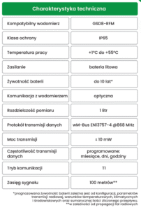 PRZESYŁANIE DANYCH – Moduł RFM-TX1.1 IP65 przesyła dane w standardzie wM-Bus EN13757-4 @868 MHz ≤ 10 mW, tryb komunikacji T1.